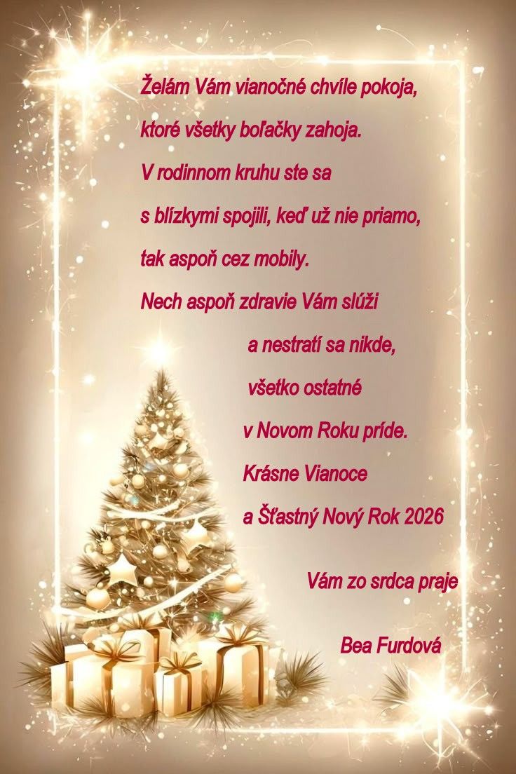 Krásny čas sviatočný a v novom roku veľa zdravia, radosti, lásky a hlavne mier.